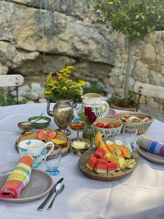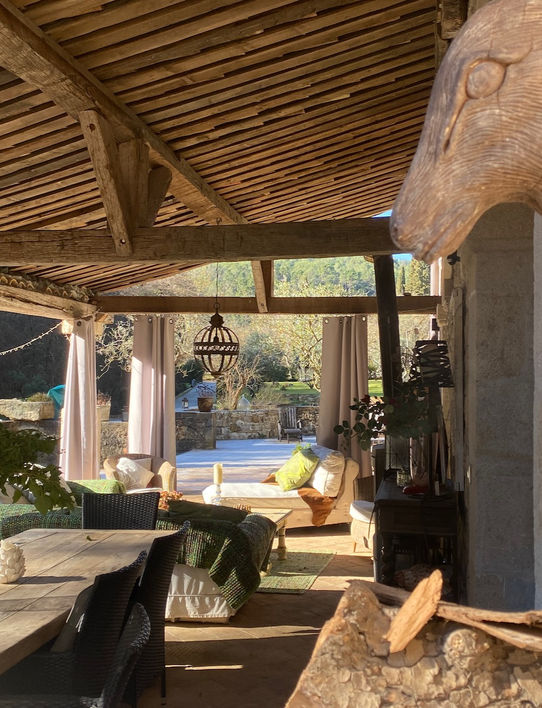A 50m2 Preau or authentic provencale covered terrace runs off the main dining area with shady seating and dining area with beautiful antique table for 20+ diners,