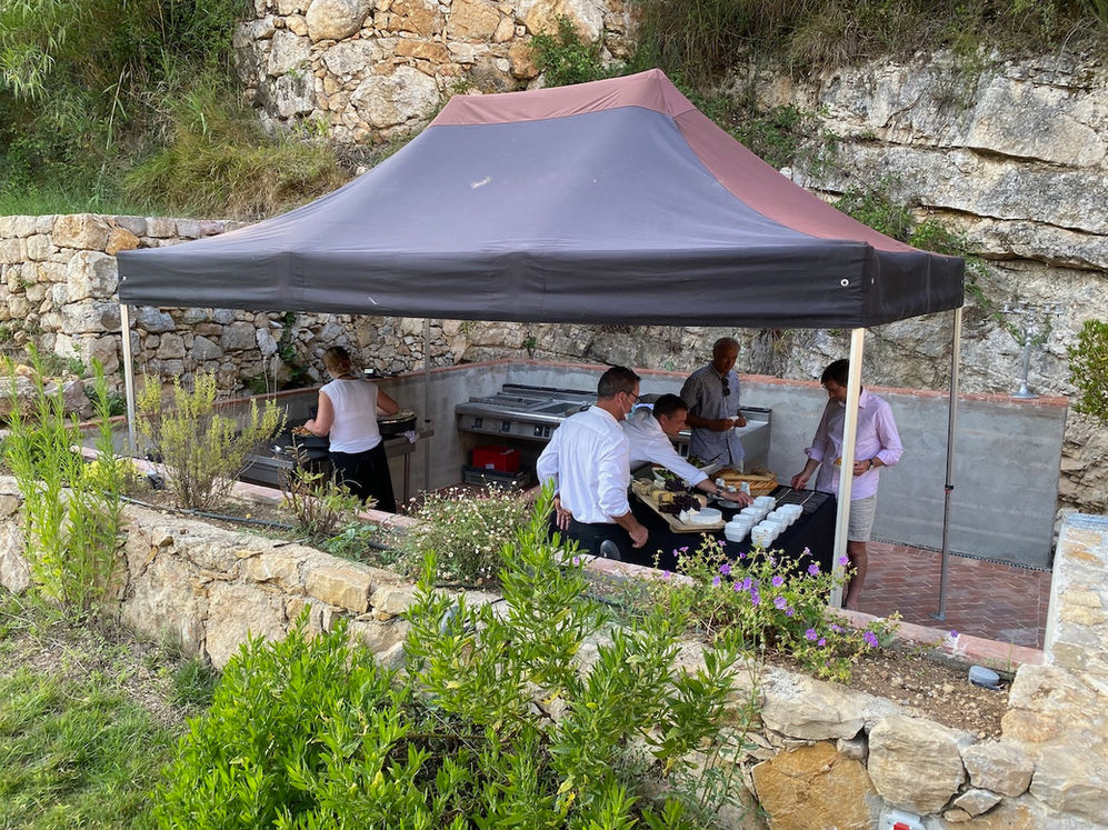 A sunken terrace boasts a professional bbq , fridge and work stations. A pretty gravel garden and fresh herbs beds with round stone dining table.